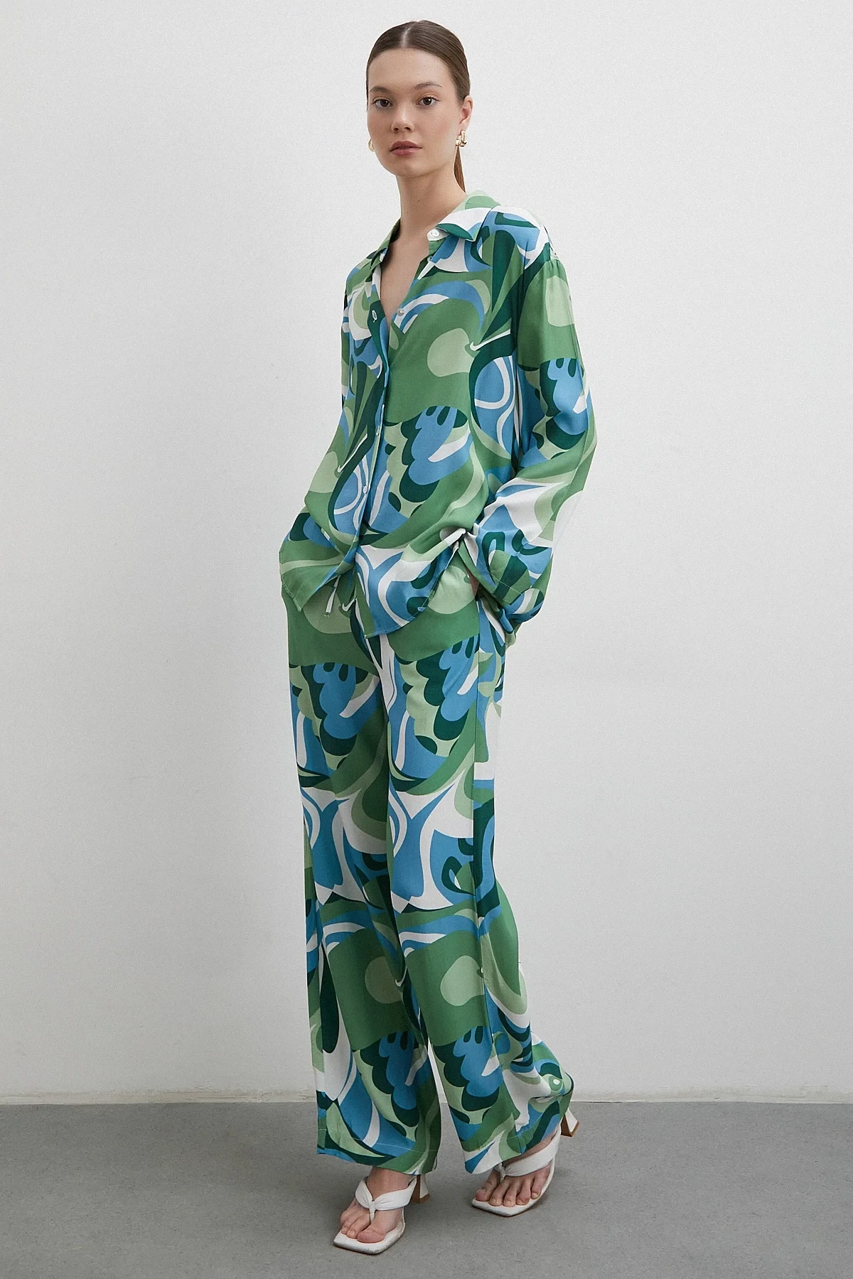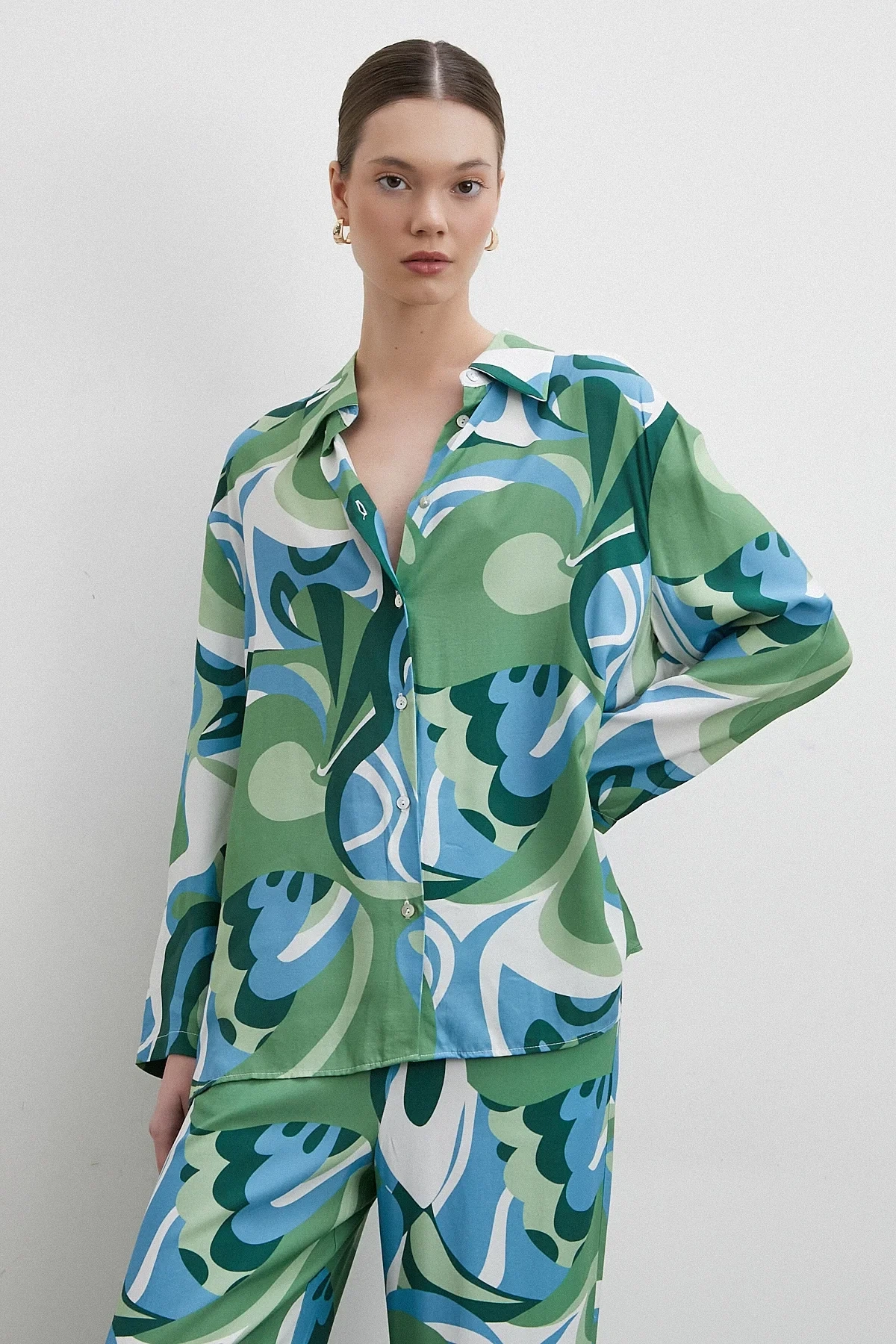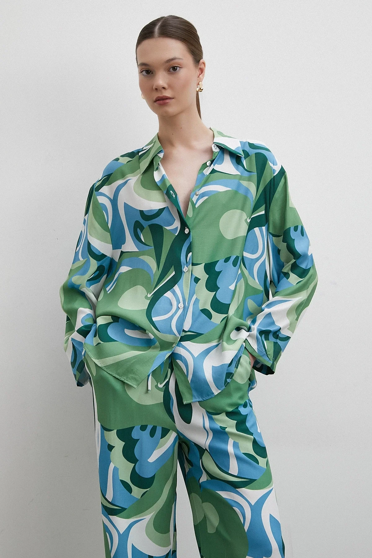 Ebruli Desenli Saten Yeşil Gömlek