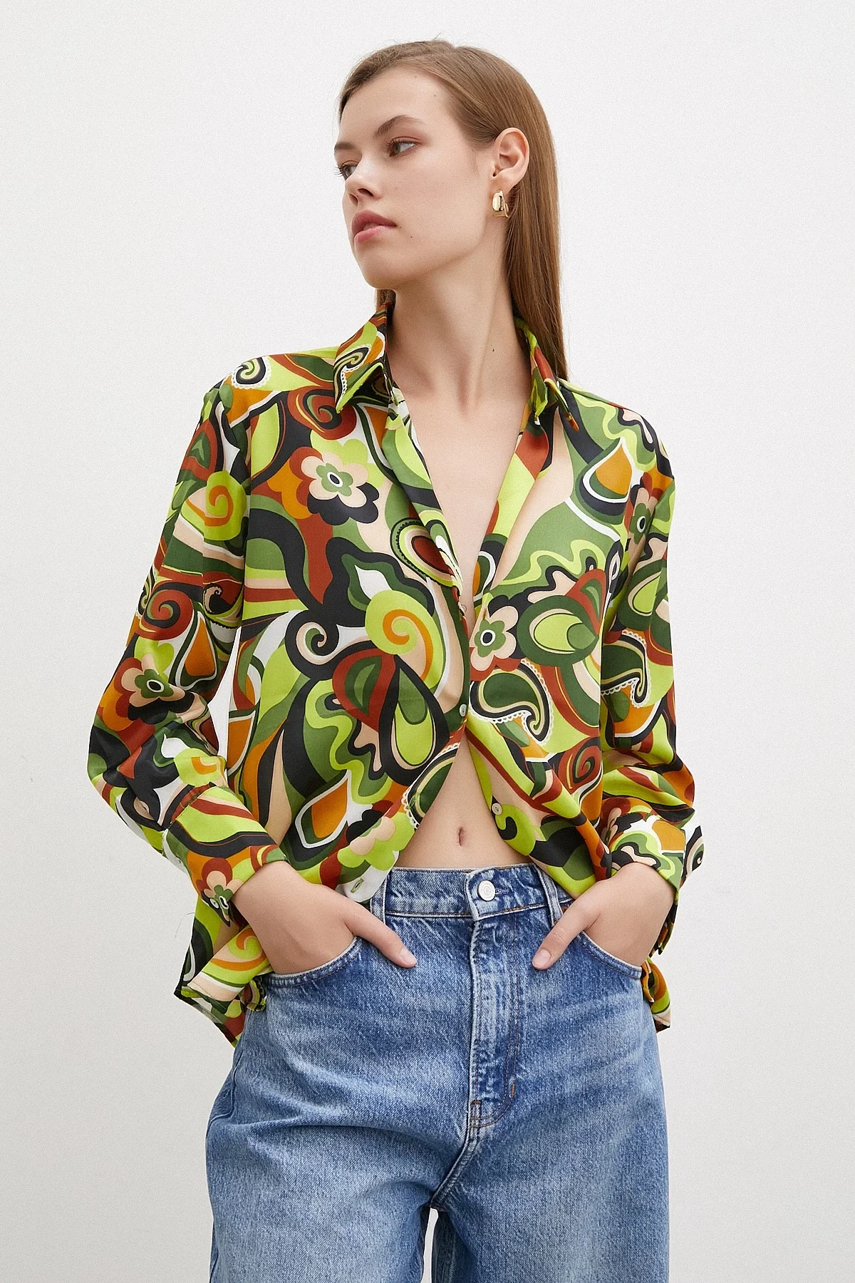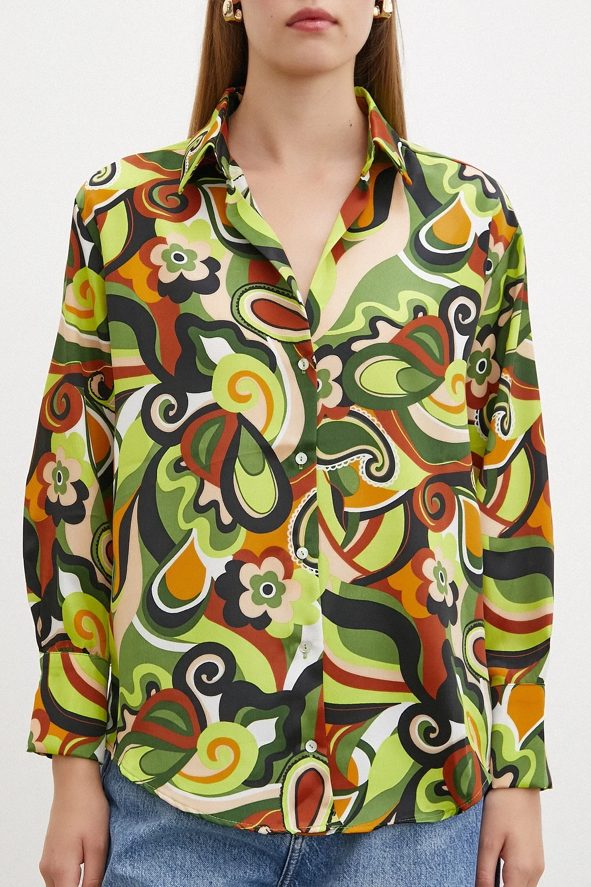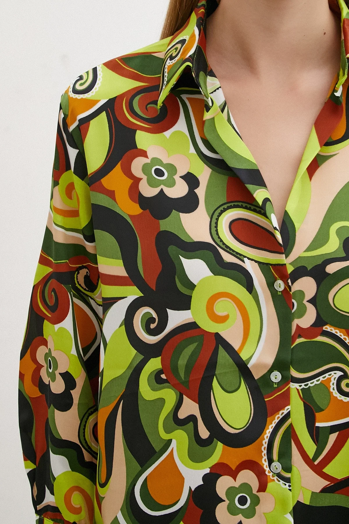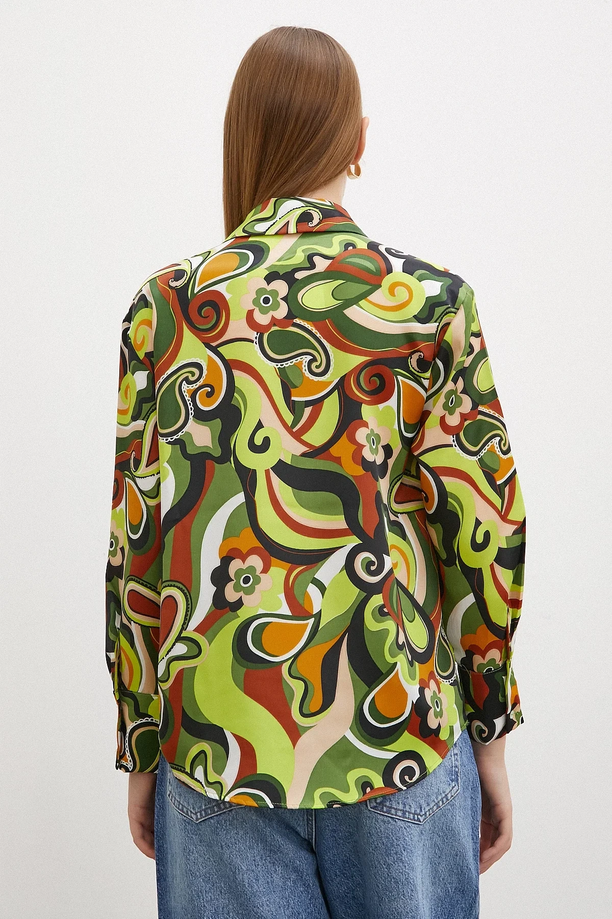 Ebruli Desenli Saten Yeşil Gömlek