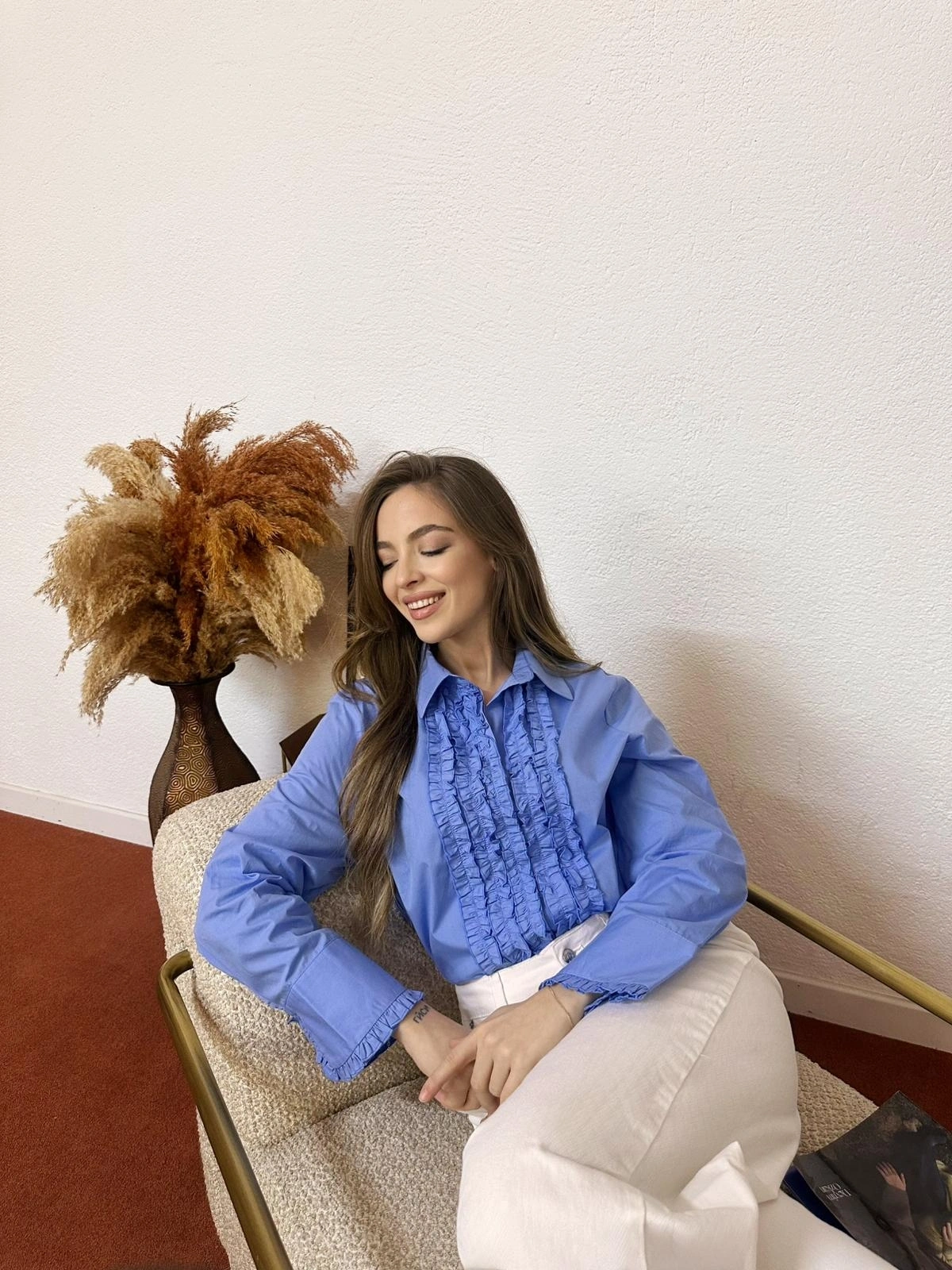 Fırfır Detaylı Uzun Kollu Gömlek Yaka Pamuklu Bluz