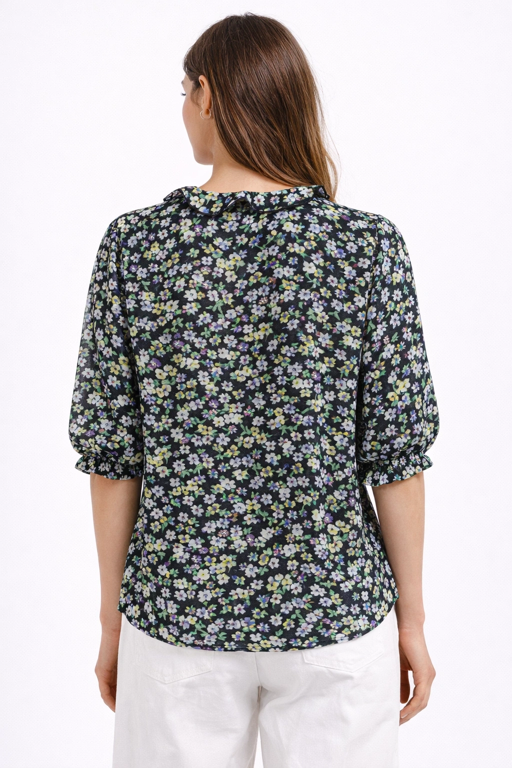 Floral Fırfırlı Düğmeli Fakir Kol Bluz