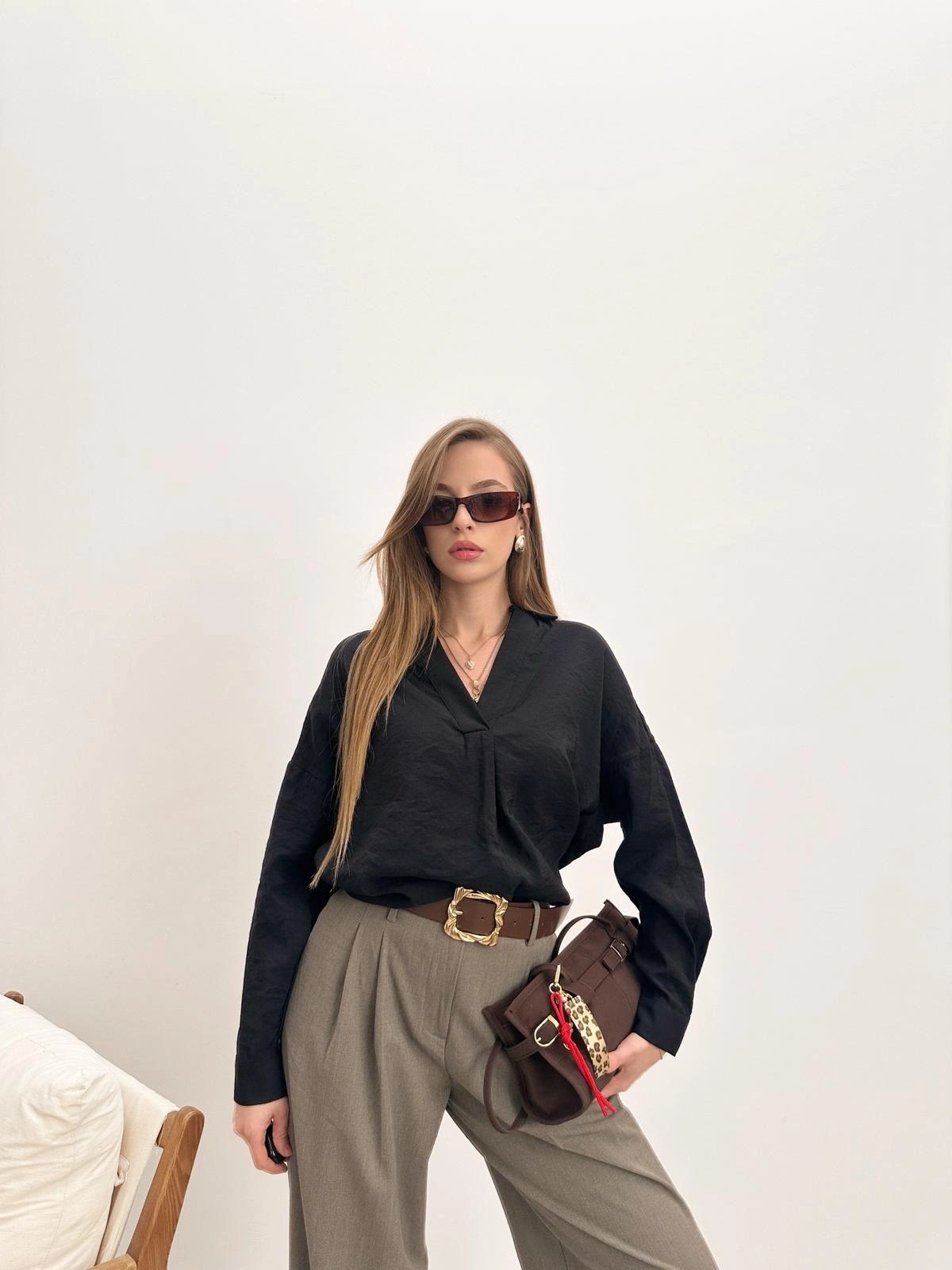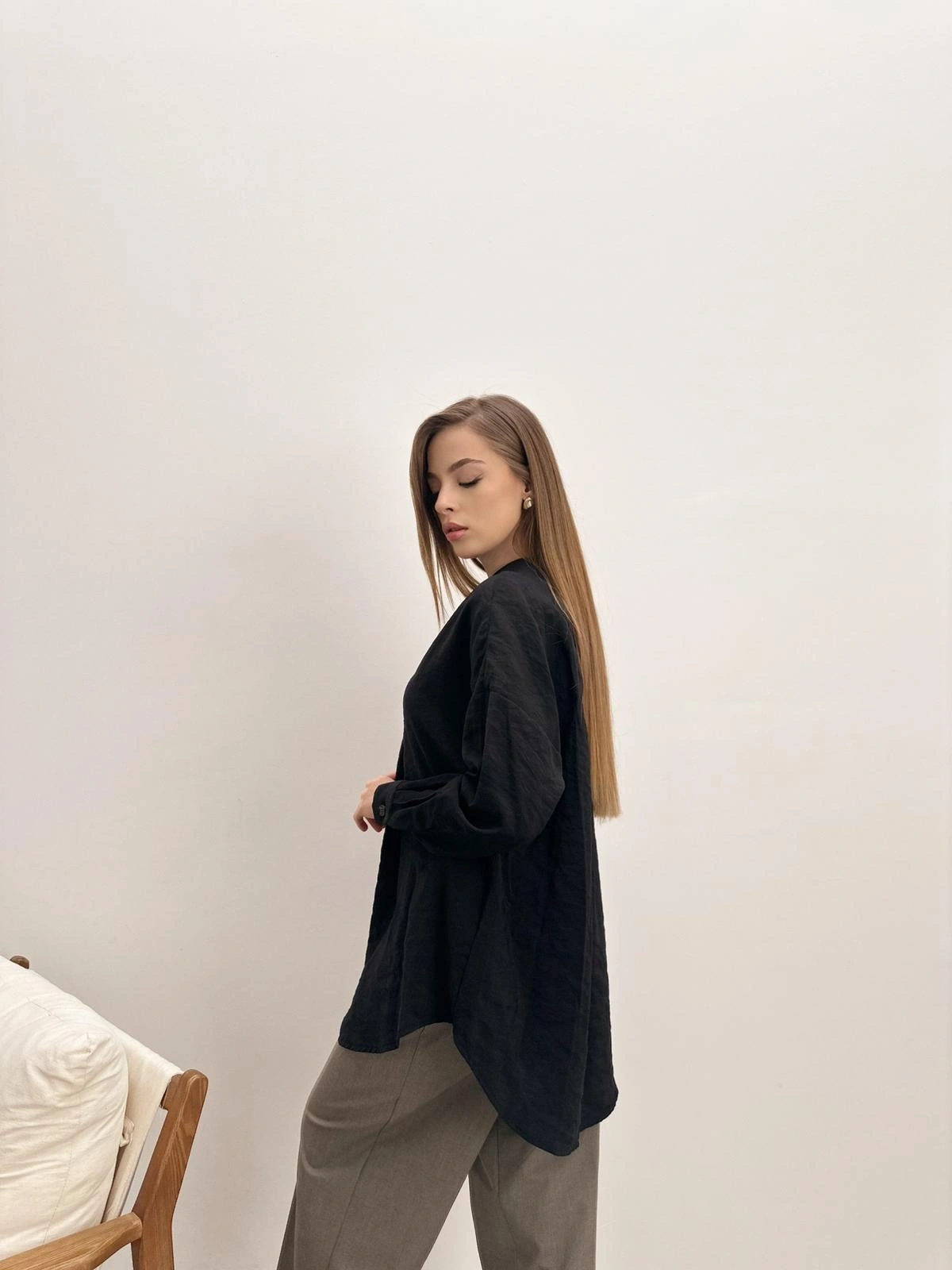 Uzun Kollu V Yaka Oversize (Geniş Kalıp) Siyah Gömlek