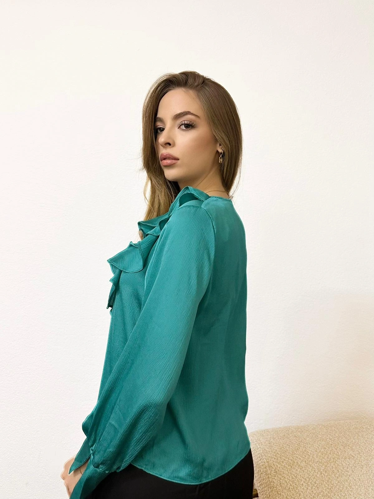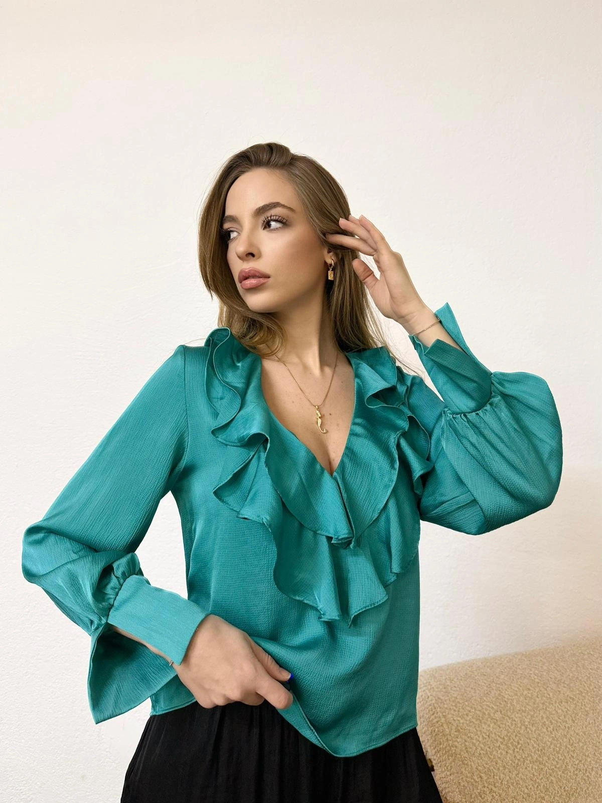 V Yaka Uzun Kollu Fırfır Detaylı Turkuaz Bluz